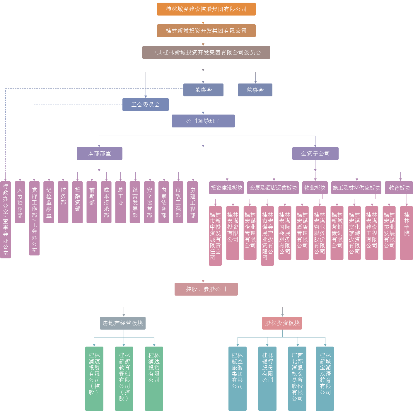 公司下設(shè)12個(gè)全資子公司,分為五大板塊,其中(一)投資建設(shè)板塊:桂林市新中投資發(fā)展有限責(zé)任公司、桂林宏謀投資有限公司、桂林宏謀企業(yè)管理有限公司、桂林市宏謀會(huì)展產(chǎn)業(yè)投資有限公司;(二)會(huì)展及酒店運(yùn)營板塊:桂林宏謀國際會(huì)展服務(wù)有限公司、桂林宏謀酒店管理有限公司;(三)物業(yè)板塊:桂林宏謀物業(yè)服務(wù)股份有限公司、桂林新城營銷策劃有限公司、桂林宏謀文化旅游投資有限公司;(四)施工及材料供應(yīng)板塊:桂林宏謀建設(shè)工程有限公司、桂林宏謀實(shí)業(yè)發(fā)展有限公司;(五)教育板塊:桂林學(xué)院。