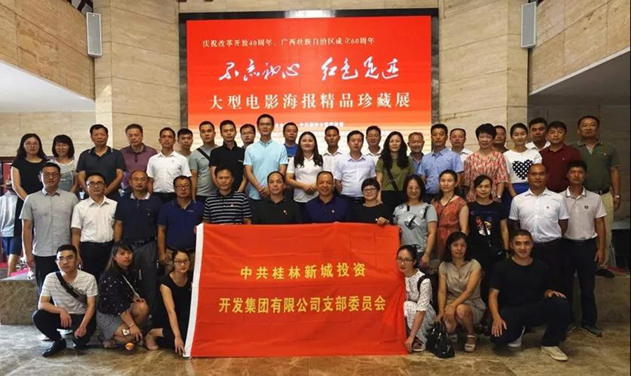 為深入學(xué)習(xí)貫徹落實習(xí)近平新時代中國特色社會主義思想和黨的十九大精神,慶祝改革開放40周年、自治區(qū)成立60周年,2018年8月23日上午新城投資集團(tuán)黨支部組織全體黨員和中層副職以上干部參觀“不忘初心?紅色足跡”大型電影海報精品珍藏展。臨桂新區(qū)工委委員、臨桂新區(qū)管委會副主任覃正東,新城投資集團(tuán)黨支部書記周道林以普通黨員身份參加了此次活動。