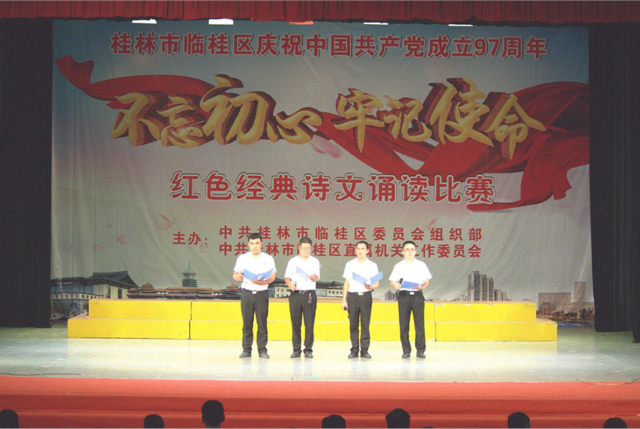 7月19日上午,陽光明媚。新城投資集團(tuán)黨支部朱憲民、譚佳璐、周成、唐忠祥四名黨員在黨支部青年委員趙建斌的帶領(lǐng)下,前往臨桂影劇院參加臨桂區(qū)委組織部、臨桂區(qū)直機(jī)關(guān)工委舉辦的“不忘初心·牢記使命”紅色經(jīng)典詩文誦讀比賽活動(dòng)。
