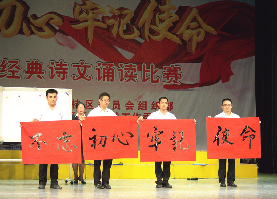 活動(dòng)中,選手們通過朗誦紅色經(jīng)典詩詞,深情回顧黨的光輝歷程、謳歌黨的豐功偉績(jī),真誠(chéng)地表達(dá)了對(duì)黨、對(duì)祖國(guó)的擁護(hù)與熱愛之情。參賽選手們儀態(tài)莊重大方,朗誦聲情并茂,以配樂、舞蹈、書法展示等多種形式,或深情款款、或激情高昂,用飽滿的熱情將紅色經(jīng)典的內(nèi)涵精彩地展現(xiàn)在觀眾面前,充分展示了臨桂區(qū)廣大黨員干部的良好精神風(fēng)貌。新城投資集團(tuán)黨支部四名黨員聲情并茂地共誦《不忘初心,牢記使命,我們永遠(yuǎn)在路上》,節(jié)目形式新穎,選手感情充沛,朗讀完詩歌后,黨員譚佳璐現(xiàn)場(chǎng)飽含情感的用毛筆書寫了“不忘初心,牢記使命”八個(gè)大字,表達(dá)了黨員們樹立遠(yuǎn)大的理想、力爭(zhēng)上游、為祖國(guó)的強(qiáng)盛貢獻(xiàn)力量的決心。與其說這是紅色經(jīng)典詩文誦讀,不如說這是一次視聽盛宴,更是黨員們愛黨愛國(guó)的精彩演繹。