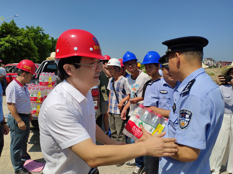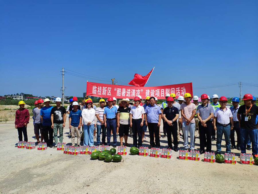 臨桂新區(qū)工委副書記、新區(qū)管委會副主任、新區(qū)黨總支書記唐標(biāo)明,臨桂新區(qū)工委委員、新區(qū)管委會副主任、機關(guān)工會主席文杰,新城投資集團黨支部書記周道林,臨桂新區(qū)工委組織人事部部長、黨總支紀(jì)檢委員梁利,新城投資集團黨支部委員、新城投資集團工會主席譚力源等領(lǐng)導(dǎo)將西瓜、飲用水等防暑降溫用品送到一線建筑工人手中。