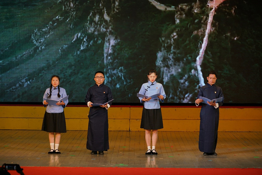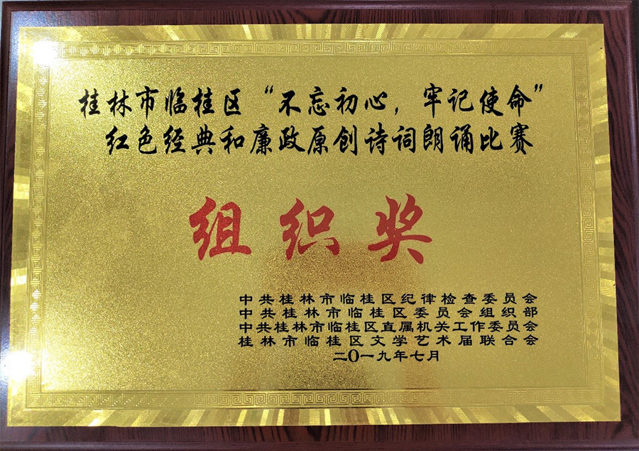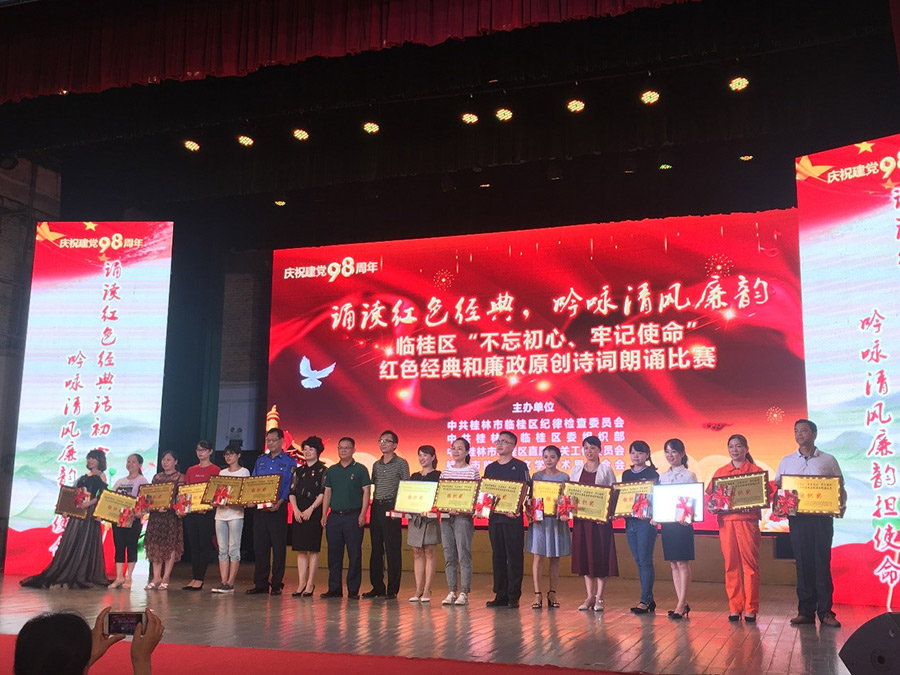 為熱烈慶祝中國共產(chǎn)黨成立98周年,向建國70周年獻(xiàn)禮,7月25日上午,新城投資集團(tuán)黨支部朱憲民、譚佳璐、唐文娟、梁雯棋四名黨員代表參加了臨桂區(qū)紀(jì)委監(jiān)委、區(qū)委組織部、區(qū)直屬機(jī)關(guān)工委、區(qū)文學(xué)藝術(shù)界聯(lián)合會(huì)舉辦的“不忘初心?牢記使命”主題教育紅色經(jīng)典和廉政詩詞朗誦比賽活動(dòng)。