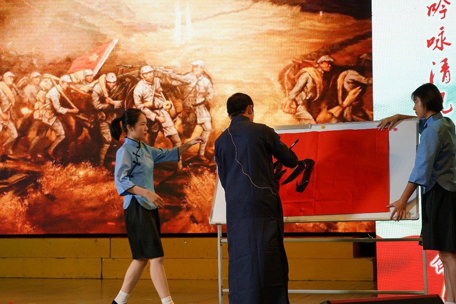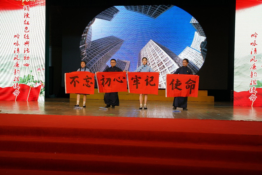 新城投資集團(tuán)黨支部四名黨員朗誦的詩歌《不忘初心,牢記使命,我們永遠(yuǎn)在路上》,節(jié)目形式新穎,選手語言真摯,富有感染力地回顧黨的光輝歷程,謳歌黨的豐功偉績和改革開放40年來取得的偉大成就,或深情款款、或激情高昂的精彩誦讀引起了在場觀眾的心靈共鳴,掌聲不斷。黨員譚佳璐在現(xiàn)場用毛筆書寫了“不忘初心,牢記使命”八個(gè)大字,表達(dá)了黨員們樹立遠(yuǎn)大的理想、力爭上游、為祖國的強(qiáng)盛貢獻(xiàn)力量的決心。