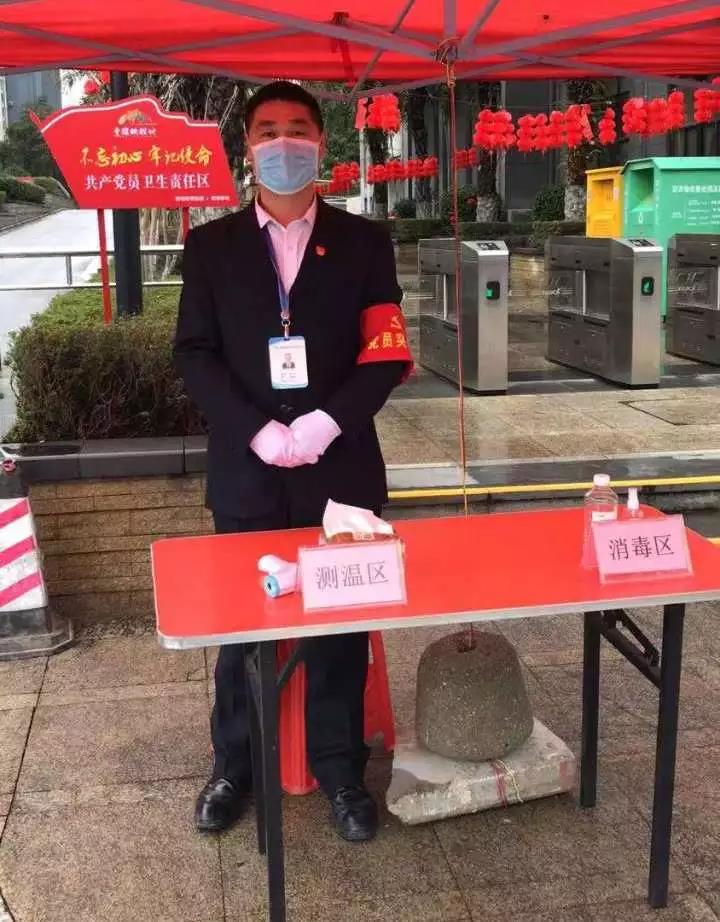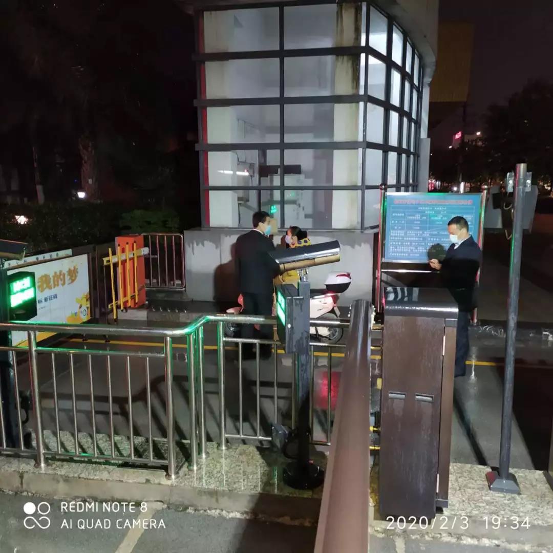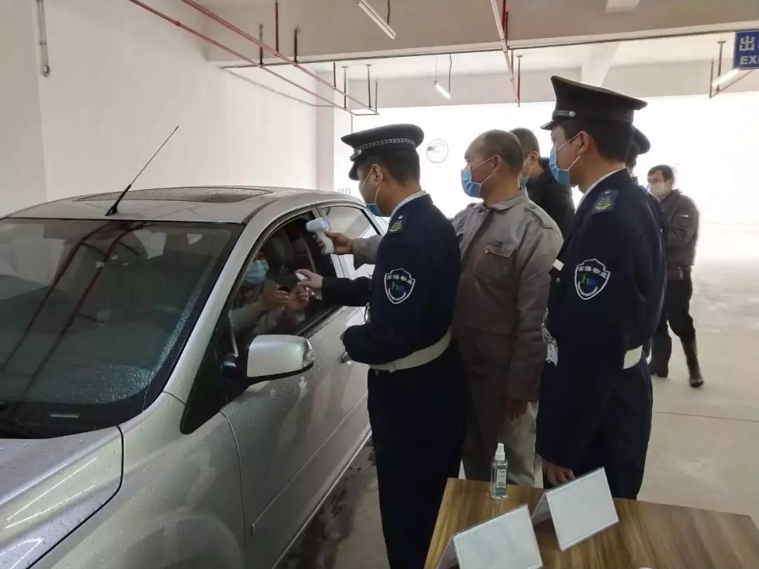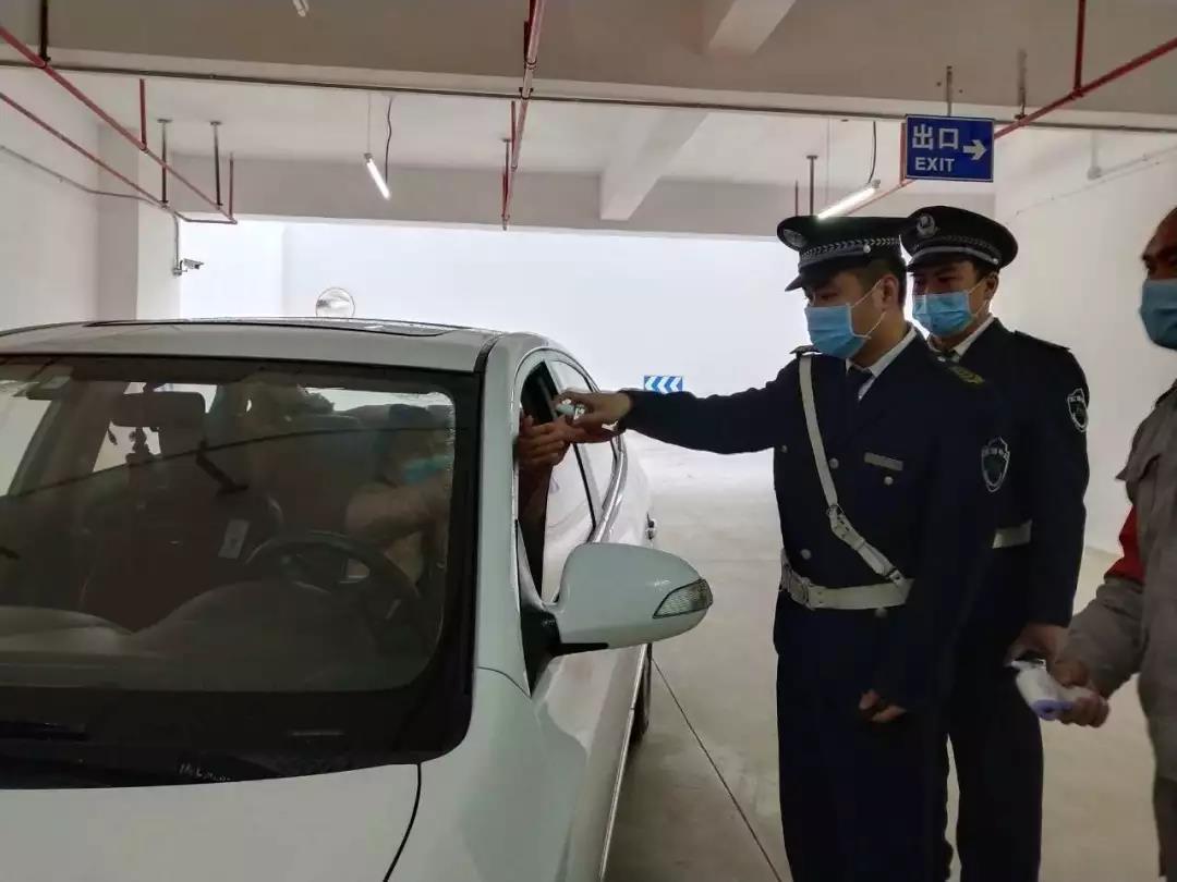 ▲地下停車場(chǎng)也設(shè)立了疫情防控崗,為進(jìn)入停車場(chǎng)停車人員測(cè)體溫、噴灑酒精消毒。