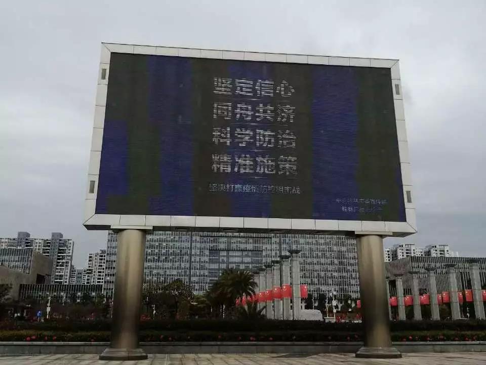 ▲市民廣場(chǎng)LED屏幕播放防疫宣傳信息。