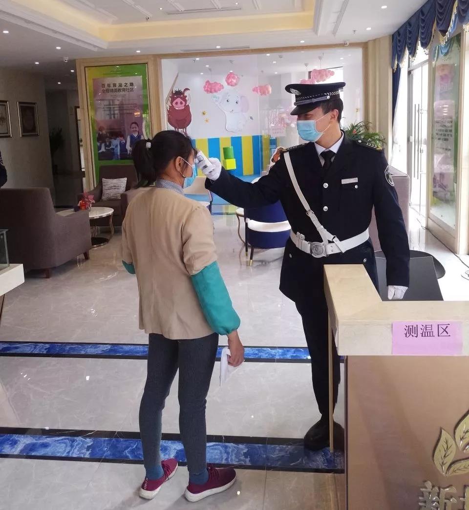 ▲新城國(guó)奧花園營(yíng)銷中心疫情防控崗在為保潔人員測(cè)體溫。