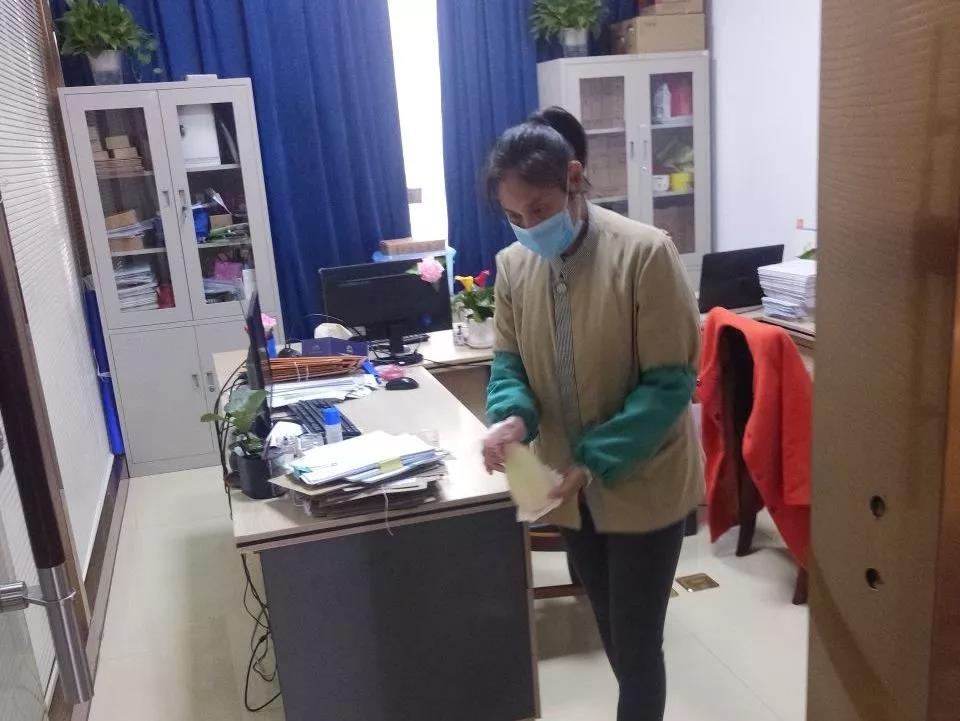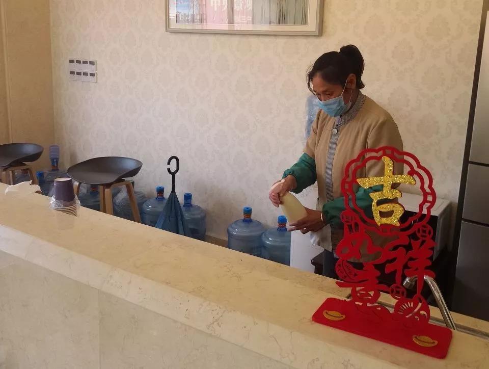 ▲保潔人員在對(duì)各門把手、茶水吧臺(tái)、辦公區(qū)域全面消毒。