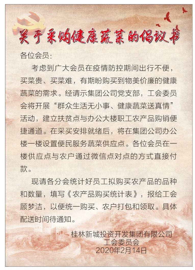“你搶著菜了嗎?”已經(jīng)成為新冠肺炎疫情下,除“你搶著口罩了嗎?”外另一句流行的打招呼方式。而居家隔離、不敢出門、菜市場貨物短缺出現(xiàn)的買菜貴、買菜難等等問題隨之而來。集團公司工會想職工之所想,始終關(guān)心職工冷暖,把“新鮮蔬菜配送到辦公樓”的想法模式孕育而生。在集團黨支部的指導下,工會委員會主動聯(lián)系周邊鄉(xiāng)鎮(zhèn)的貧困農(nóng)戶,組織開展“群眾生活無小事、健康蔬菜送真情”點對點活動,即開通扶貧點農(nóng)戶的農(nóng)產(chǎn)品與辦公大樓職工的購銷便捷通道,這種做法不僅充分發(fā)揮了工會聯(lián)系群眾的橋梁紐帶作用,把密切聯(lián)系群眾的優(yōu)勢轉(zhuǎn)化為疫情防控的優(yōu)勢,而且還搭建起了一座防疫與扶貧的愛心橋,將“群眾利益無小事,一枝一葉總關(guān)情”的工會服務(wù)理念落在了實處。