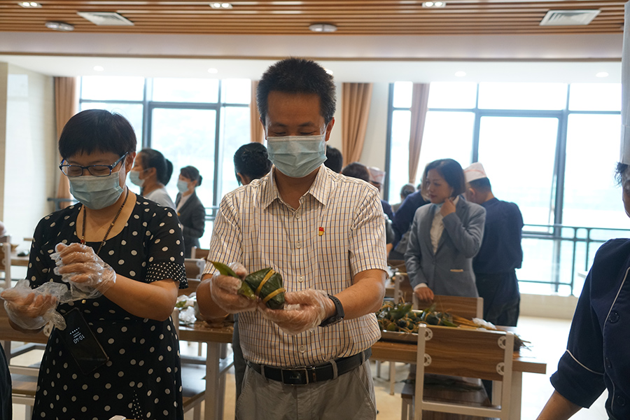 在集團公司會場,工會會員宏謀酒店廚師鄧軍紅現場教學,教大家包正宗的宏謀粽子?,F場員工現學現包,各顯神通,歡快的展示自己的作品。