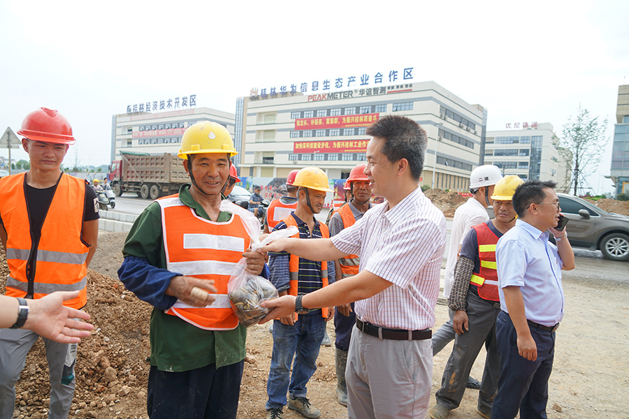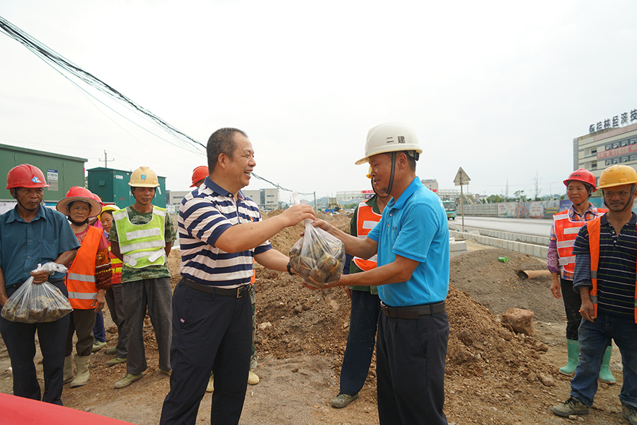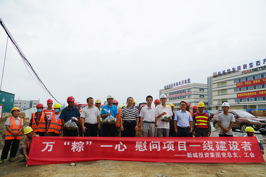 上午,新城投資集團黨總支、工會還開展了“萬'粽'一心,共創(chuàng)文明城”端午節(jié)慰問項目一線建設者活動,臨桂新區(qū)工委委員、管委會副主任文杰,集團黨總支書記、董事長周道林率隊帶著新鮮出爐的粽子,來到西城大道南延長線兩個標段施工現場,為奮斗在市政府限期完工的西城大道南延長線,慰問一線的190名建設者們。
