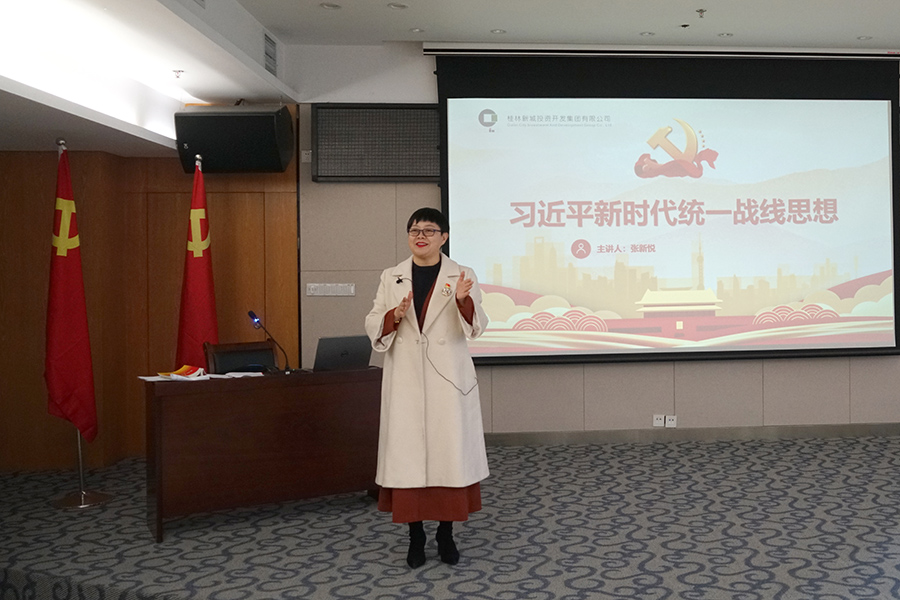 2020年12月31日,桂林新城投資集團(tuán)黨總支統(tǒng)戰(zhàn)委員張新悅以“習(xí)近平新時代統(tǒng)一戰(zhàn)線思想”為主題,給集團(tuán)公司第二黨支部黨員、發(fā)展對象、入黨積極分子,分管部室、子公司負(fù)責(zé)人上了一堂專題黨課。