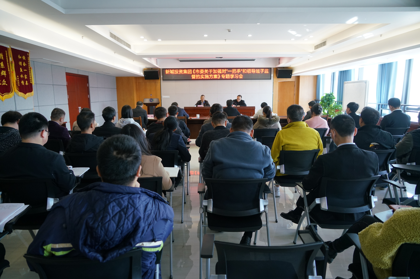 為貫徹落實全面從嚴治黨要求,加強對“一把手”行使權力的有效監(jiān)督,根據(jù)市紀委監(jiān)委駐臨桂新區(qū)管委會紀檢監(jiān)察組要求,11月10日上午,新城投資集團組織召開《市委關于加強對“一把手”和領導班子監(jiān)督的實施方案》專題學習會。集團黨總支書記、董事長周道林,總經(jīng)理黃峻參加會議。