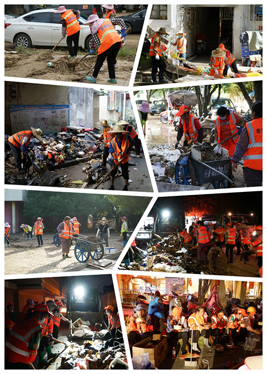 在龍船坪小區(qū)、安新小區(qū)、寧遠小學及周邊街道,一群身著橘紅色馬甲、印有“宏謀環(huán)衛(wèi)”的環(huán)衛(wèi)工人成為了救災現場的一道亮麗風景線。他們不畏艱難,深一腳淺一腳地踩在垃圾堆和泥漿中,一鍬一鍬地清理垃圾和淤泥?,F場工作人員齊心協(xié)力,面對困難毫不退縮,甚至唱起了《團結就是力量》來鼓舞士氣。經過晝夜奮戰(zhàn),他們終于將小區(qū)道路上的垃圾清運完畢,有效保障了道路的正常通行和居民的出行安全,及時防止災后疫情的發(fā)生。