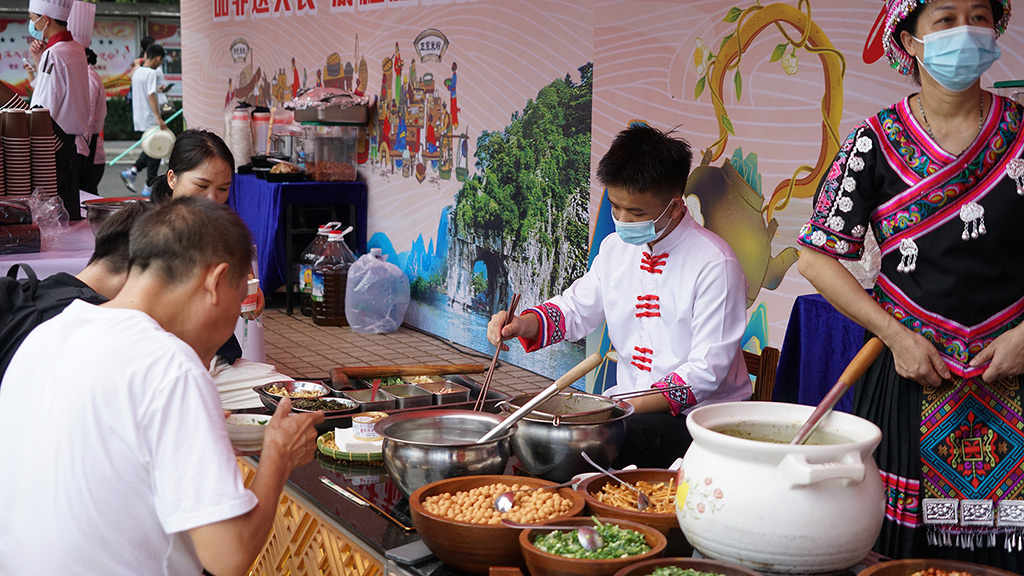 活動(dòng)現(xiàn)場(chǎng),“品非遺美食,游桂林山水”的主題引人入勝,桂林米粉、恭城油茶“非遺”文化展示及品嘗等活動(dòng)精彩紛呈。為確?;顒?dòng)的順利進(jìn)行,宏謀酒管公司迅速組織了20名一線工作者,他們不懼烈日高溫,全心全意地投入到工作中。盡管汗水浸透了他們的衣衫,但他們始終保持著飽滿的熱情和專注,為新生們提供了優(yōu)質(zhì)的服務(wù)?;顒?dòng)現(xiàn)場(chǎng)氛圍火爆,總計(jì)供應(yīng)了2000碗米粉以及1500碗油茶,為初來乍到新生和家長(zhǎng)們帶來了一場(chǎng)別具特色的美食文化盛宴。