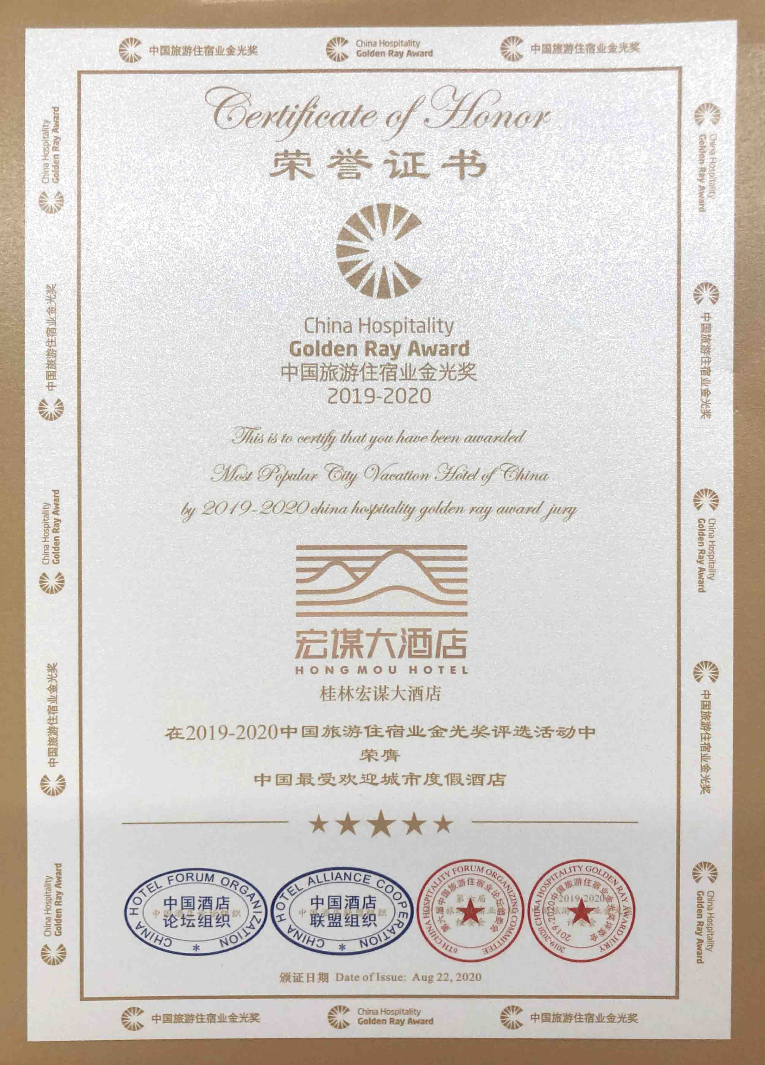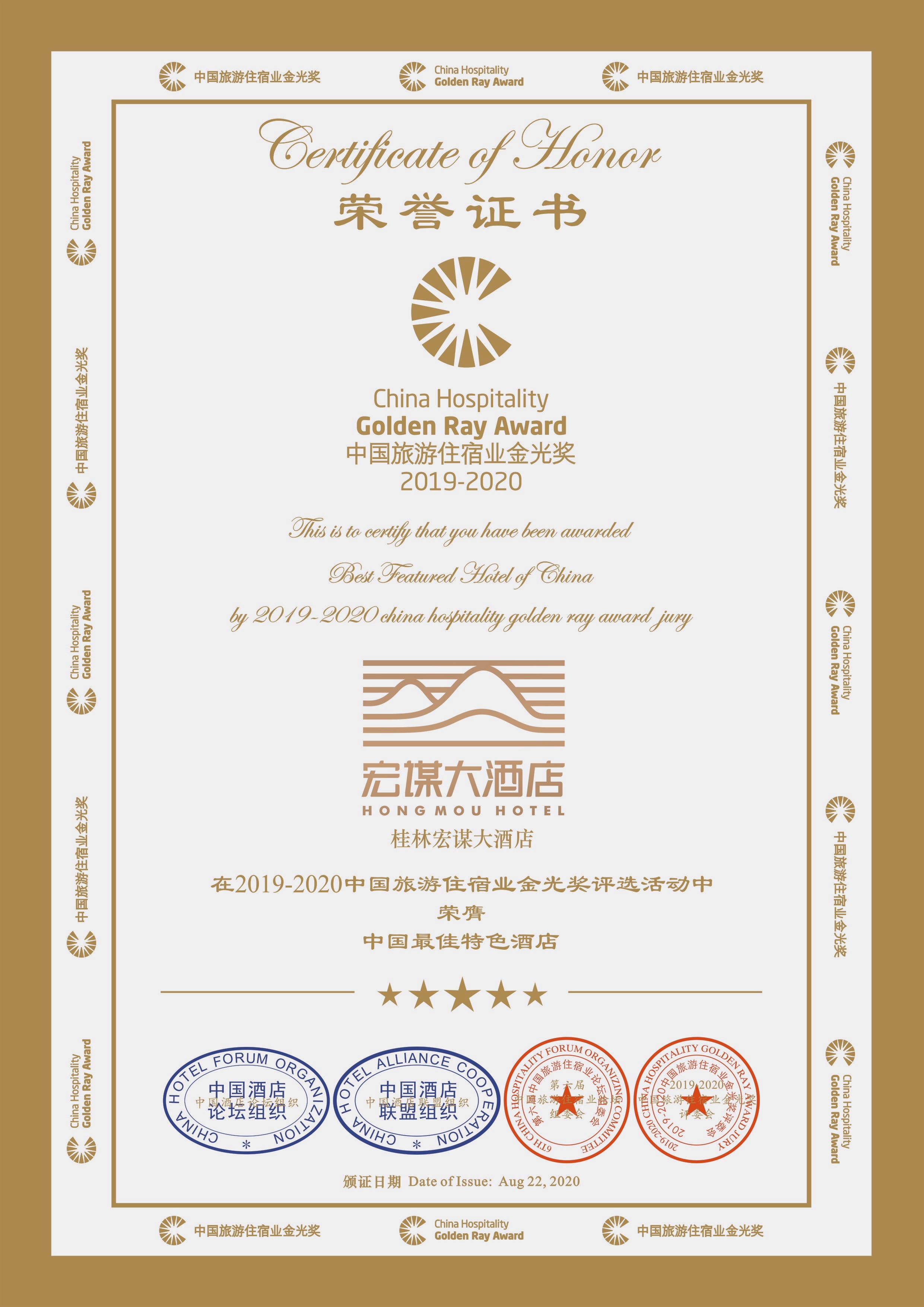 金光獎(jiǎng)是中國(guó)旅游住宿行業(yè)跨業(yè)界、跨年度、覆蓋面最廣的獎(jiǎng)項(xiàng),獲獎(jiǎng)評(píng)選經(jīng)過(guò)各學(xué)術(shù)、專業(yè)、跨界領(lǐng)域評(píng)委根據(jù)各酒店競(jìng)爭(zhēng)力、住房率、收益利潤(rùn)等多個(gè)標(biāo)準(zhǔn)評(píng)選而出。桂林宏謀大酒店此次榮獲中國(guó)酒店金光獎(jiǎng)的兩項(xiàng)殊榮,是對(duì)酒店不斷深化文化藝術(shù)主題,追求酒店優(yōu)秀服務(wù)品質(zhì)的認(rèn)可!