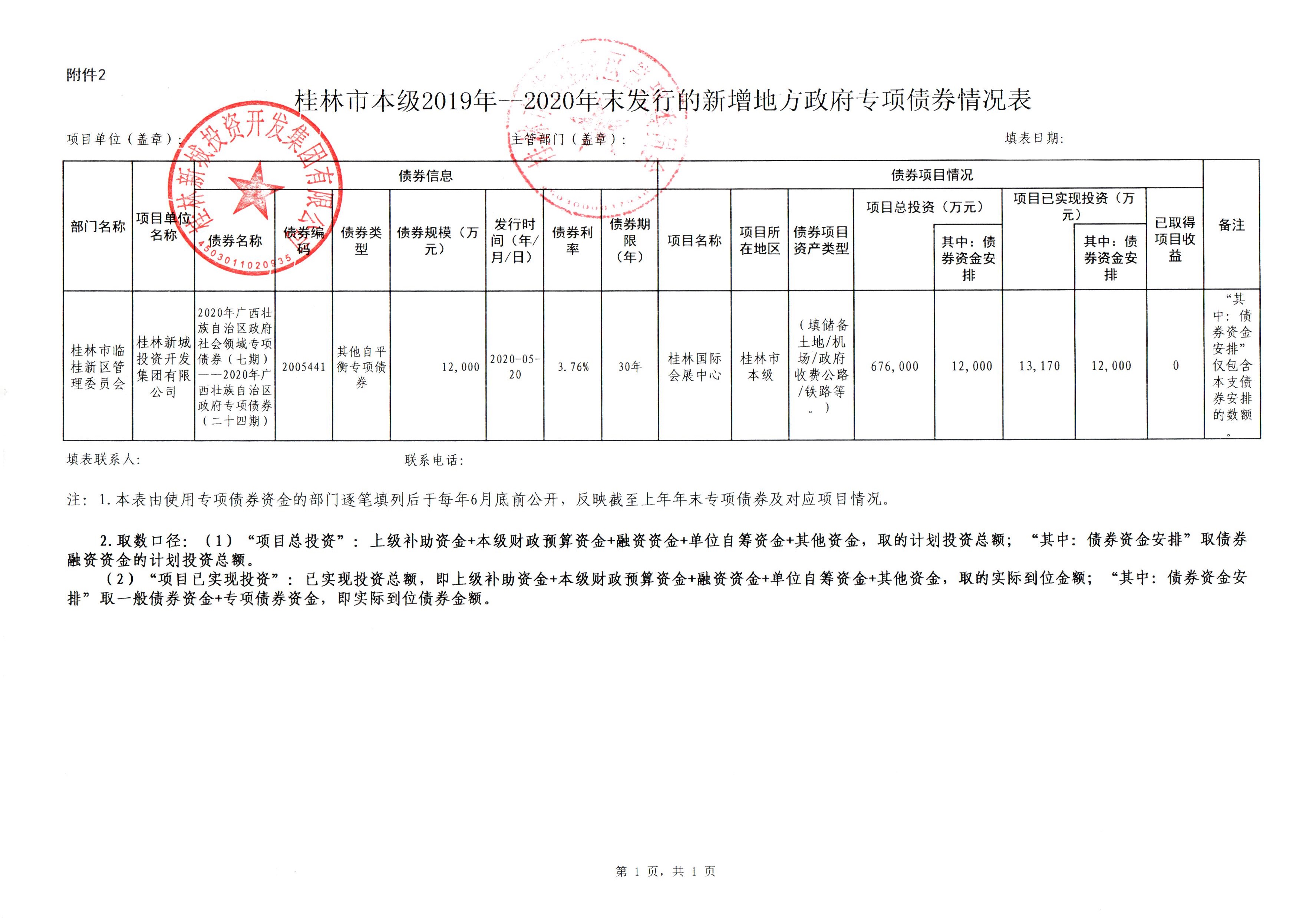 桂林市本級2019年--2020年末發(fā)行的新增地方政府專項債券情況表(臨桂新區(qū))