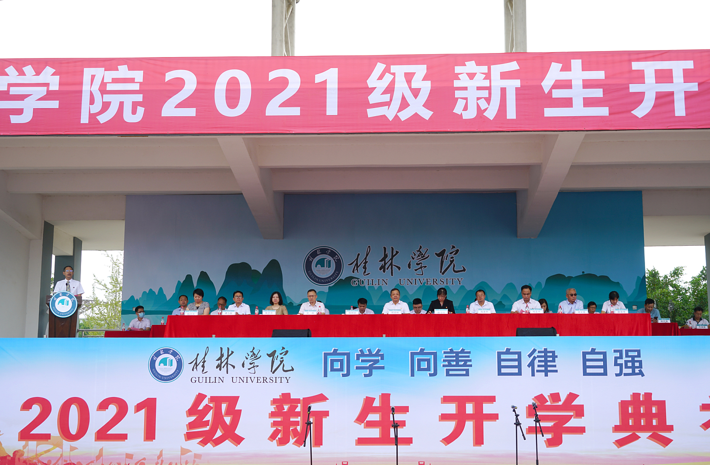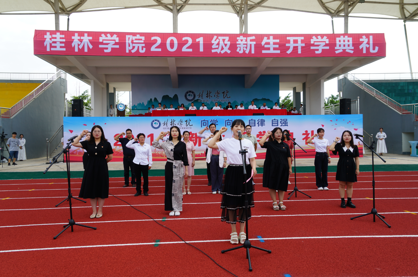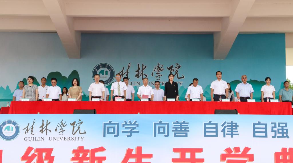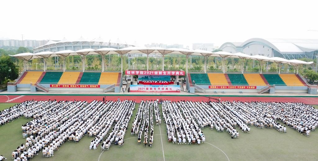 9月17日上午,桂林學(xué)院2021級(jí)新生開學(xué)典禮在學(xué)校田徑場(chǎng)舉行。2021級(jí)來自全國各地的3160名新生和新生親友通過現(xiàn)場(chǎng)與視頻直播相結(jié)合的形式,共同參加和觀看了開學(xué)典禮。桂林學(xué)院董事長周道林,桂林學(xué)院校長楊樹喆以及學(xué)校董事、監(jiān)事、校領(lǐng)導(dǎo)出席典禮。各二級(jí)學(xué)院、職能教輔部門主要負(fù)責(zé)人,各黨總支書記、副書記,全體新生輔導(dǎo)員,教師代表,校友代表參加典禮。開學(xué)典禮由校黨委書記唐文紅主持。
