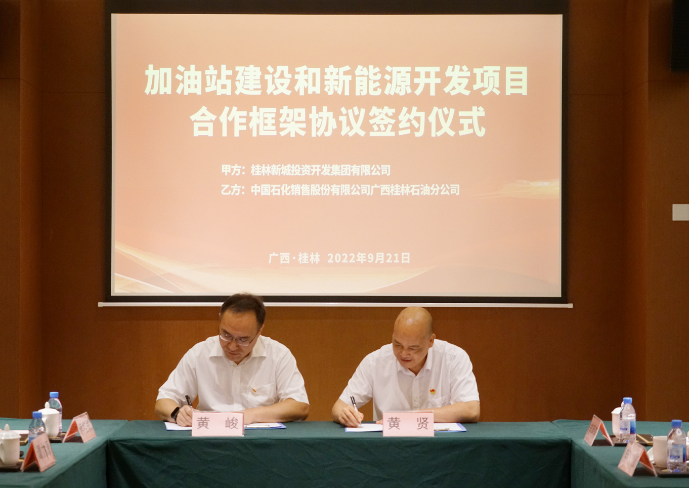 2022年9月21日,桂林新城投資開發(fā)集團有限公司(以下簡稱新城投集團)與中國石化銷售股份有限公司廣西桂林石油分公司(以下簡稱中石化桂林分公司)在桂林宏謀大酒店舉行桂林新區(qū)加油站建設和新能源開發(fā)項目合作框架協(xié)議簽約儀式。臨桂新區(qū)黨工委委員、管委會常務副主任李星明,黨工委委員、管委會副主任張慧慶,新城投集團黨總支副書記、總經理黃峻,中石化桂林分公司總經理黃賢出席簽約儀式。簽約儀式由新城投集團副總經理吳濤主持。