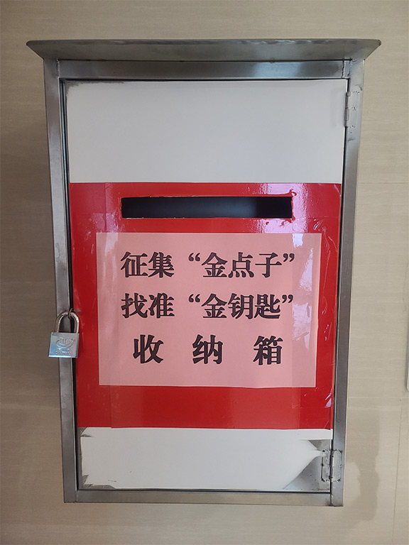 在公司15樓設(shè)置征集“金點(diǎn)子”找準(zhǔn)“金鑰匙”收納箱,直接由總經(jīng)理開取收納箱??偨?jīng)理將根據(jù)方案的可行性安排時(shí)間與提出方案的個(gè)人及團(tuán)隊(duì)見面,聽取方案介紹,探討落實(shí)對(duì)策。