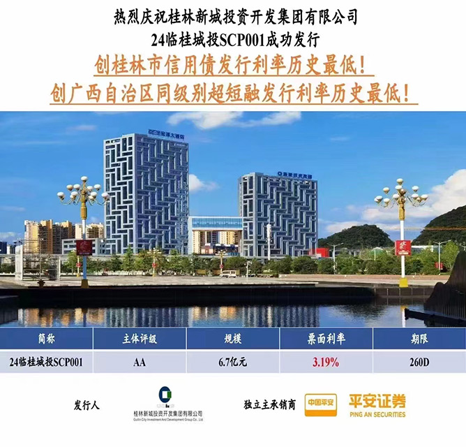 1月9日,桂林城鄉(xiāng)建設(shè)控股集團(tuán)旗下桂林新城投資開發(fā)集團(tuán)有限公司成功發(fā)行2024年度第一期超短融,規(guī)模6.7億元,期限260天,票面利率3.19%,認(rèn)購(gòu)倍數(shù)5.08倍,本期超短融由平安證券獨(dú)立承銷。此次成功發(fā)行超短融創(chuàng)下桂林市有史以來信用債發(fā)行的最低利率,也是有史以來廣西壯族自治區(qū)同級(jí)別超短融發(fā)行利率最低!在市委市政府、市金融辦、市國(guó)資委、城建集團(tuán)的指導(dǎo)幫助下,新城投集團(tuán)認(rèn)真落實(shí)各項(xiàng)決策部署,結(jié)合自身實(shí)際,爭(zhēng)分奪秒抓發(fā)展,多措并舉促融資。