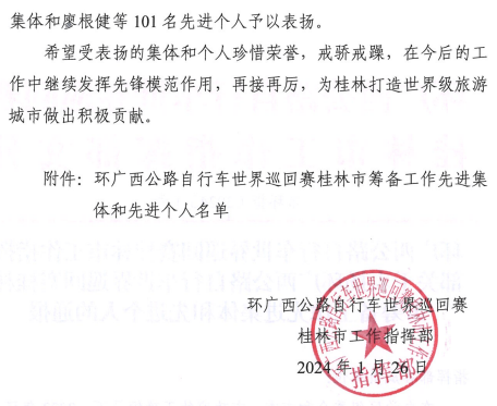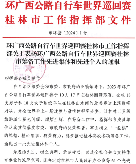 近日,根據(jù)《環(huán)廣西公路自行車世界巡回賽桂林市工作指揮部關(guān)于表揚環(huán)廣西公路自行車世界巡回賽桂林市籌備工作先進集體和先進個人的通報》(市環(huán)指[2024]1號)獲悉,新城投集團下屬宏謀物業(yè)公司李楓彥同志獲環(huán)廣西公路自行車世界巡回賽桂林市籌備工作先進個人。