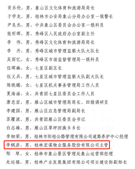 新城投集團下屬宏謀物業(yè)公司李楓彥同志獲環(huán)廣西公路自行車世界巡回賽桂林市籌備工作先進個人榮譽稱號