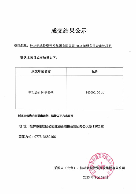 桂林新城投資開發(fā)集團有限公司2023年財務報表審計項目成交結(jié)果公示