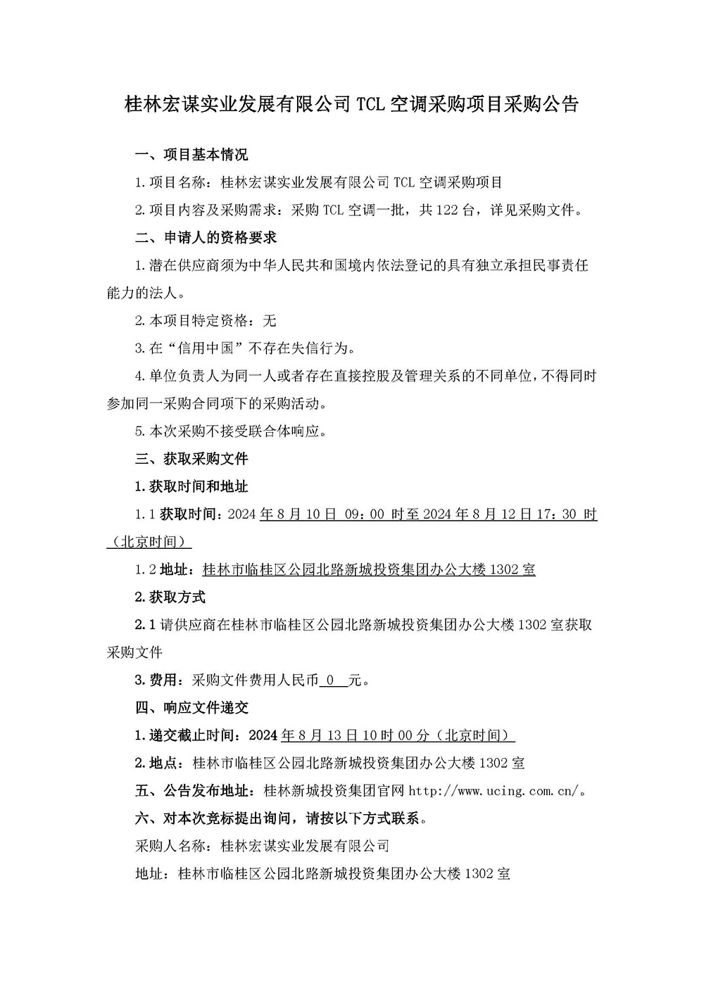 桂林宏謀實(shí)業(yè)發(fā)展有限公司TCL空調(diào)采購項(xiàng)目采購公告