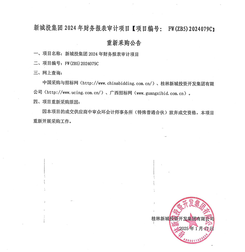 新城投集團(tuán)2024年財務(wù)報表審計項目【FW(ZB5)2024079C】重新采購公告