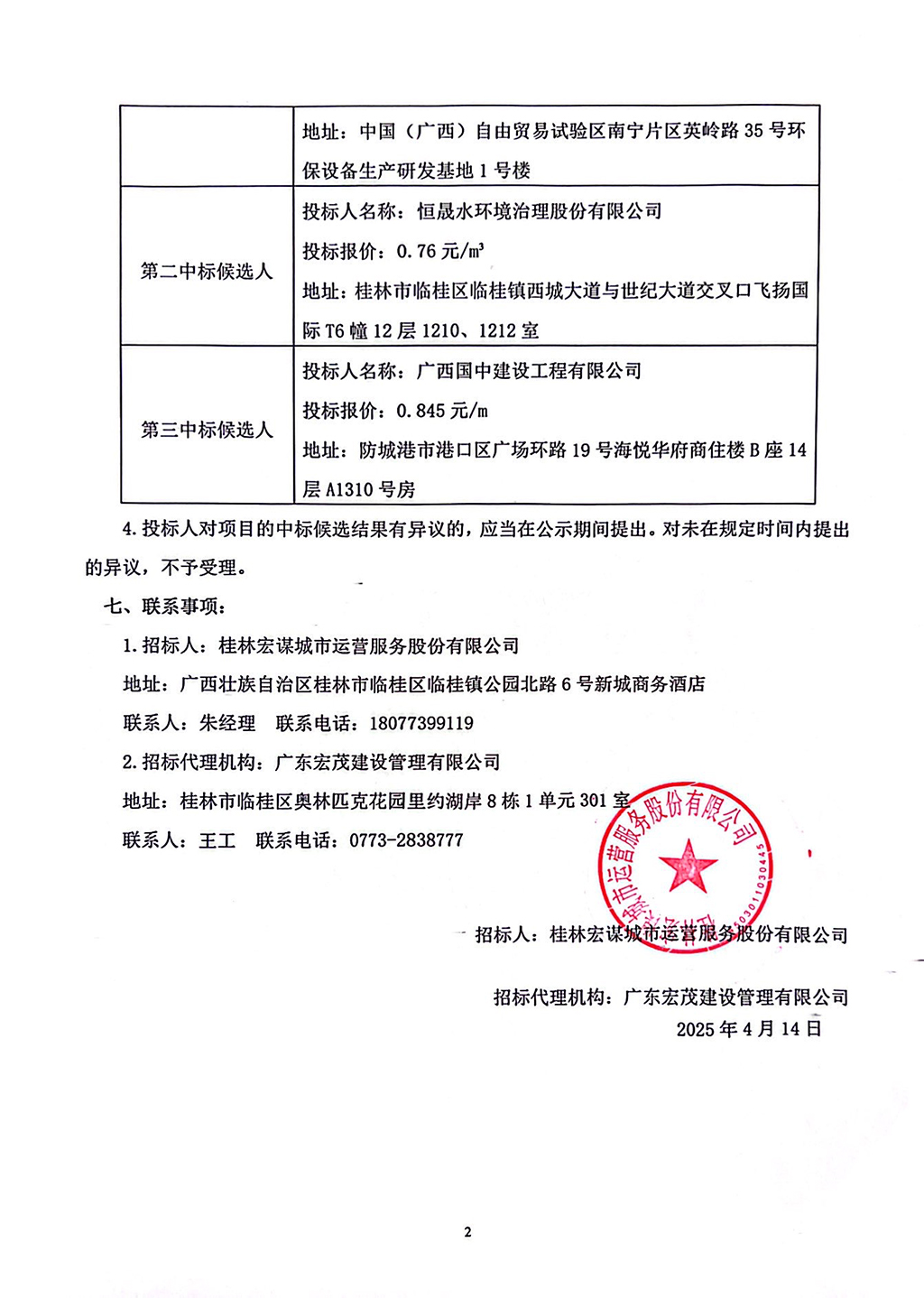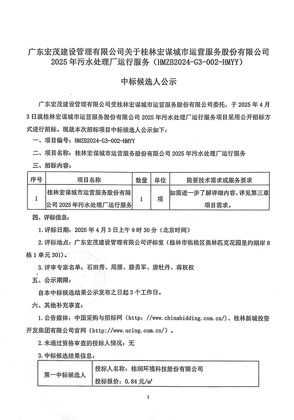 廣東宏茂建設(shè)管理有限公司關(guān)于桂林宏謀城市運營服務(wù)股份有限公司2025年污水處理廠運行服務(wù)(HMZB2024-G3-002-HMYY)中標候選人公示
