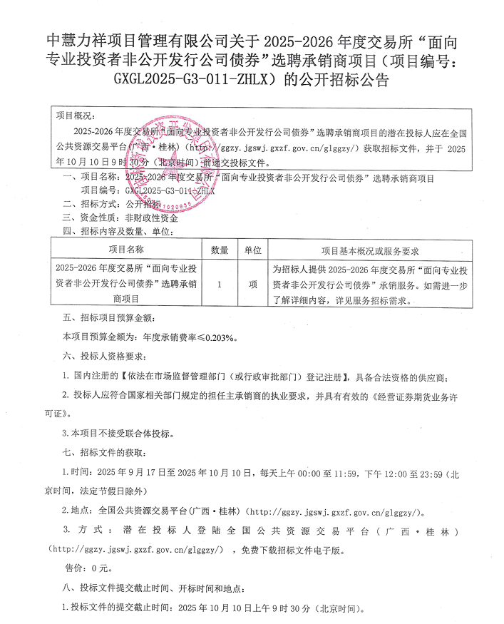 中慧力祥項目管理有限公司關于2025-2026年度交易所“面向專業(yè)投資者非公開發(fā)行公司債券”選聘承銷商項目(項目編號:GXGL2025-G3-011-ZHLX)的公開招標公告